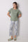 بيجاما مصنوعة من قماش القطن 100% مع قميص أخضر سادة وبنطال مزخرف بطبعة بأسلوب "وشاح". مثالية للبقاء في المنزل بشكل مريح وأنيق.