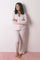 بيجاما كلاسيكية بأكمام طويلة وبنطال طويل بطبعة مخططة. تتميز البلوزة بياقة بطية وأزرار لؤلؤية، مع تفصيل بايبينغ وردي وجيب على الصدر برسالة مرحة. البنطال بخصر مطاطي ورباط وردي.