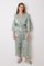 طقم بيجاما يتكون من: روب قصير، قميص وسروال طويل؛ مصنوع من قماش كريب الشيفون وتفاصيل الدانتيل، بألوان خضراء مع طباعة زهور. ناعمة جدًا ومريحة، لن ترغبي في خلعها طوال اليوم. مثالية لهذا الموسم!