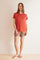 تي شيرت بأكمام قصيرة بلون أحمر جميل من قماش الكتان والفيسكوز. مثالي لوقت النوم، الاسترخاء في المنزل، أو الإطلالات اليومية المريحة.