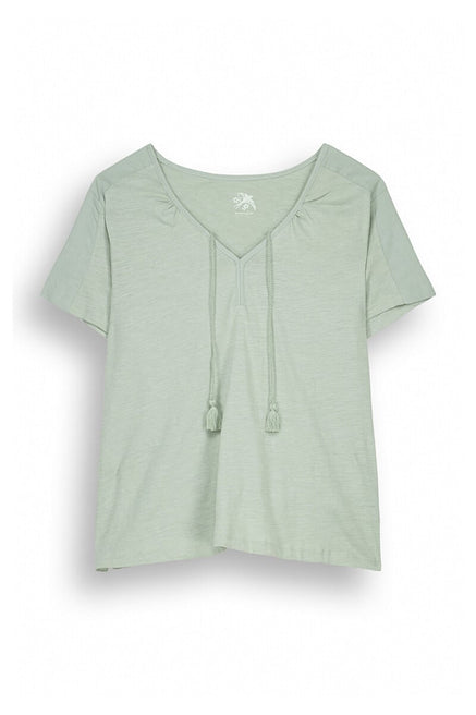 - V neckline with gathered detail and laces with matching tassels .