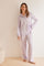 Classic pyjamas with long sleeves and trousers in a cute lilac colour made of satin fabric with piping details in lime green.